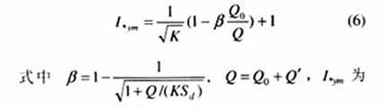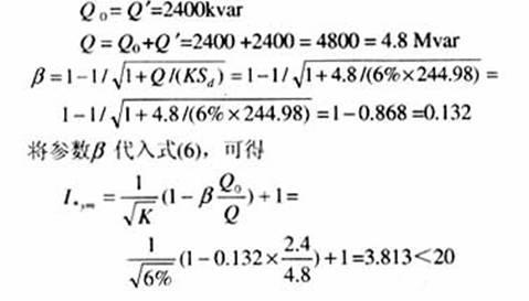 涌流峰值的標幺值(以投入的電容器組額定電流的峰值為基準值);Q為電容器組的總?cè)萘浚琈var;Q0為正在投入的電容器組的總?cè)萘?,Mvar;Q¢為所有原來已經(jīng)運行的電容器組的總?cè)萘?,Mvar;b為電源影響系數(shù)。 已知兩套電容器裝置均為單組投切